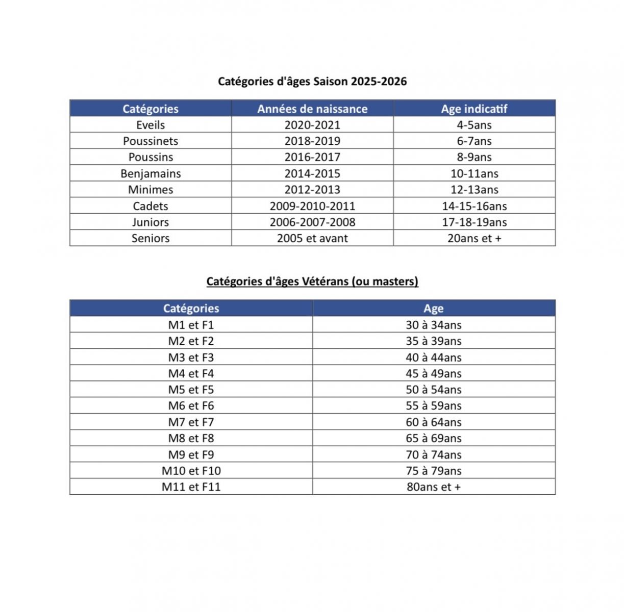 Les catégories d’âge 2025-2026